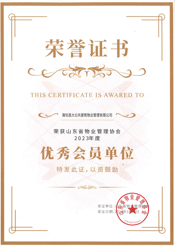 2023年度山东省物业管理协会优秀会员单位证书